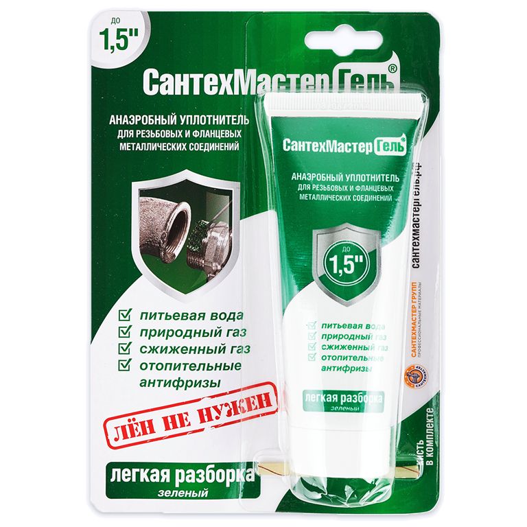 СантехМастер Гель зеленый 60г — это резьбовой герметик для металлических соединений, которые располагаются в тяжело доступных местах, где невозможно использовать иные уплотнительные материалы. Он разработан для быстрой и качественной герметизации металлических фланцевых и резьбовых соединений. Данный гель-герметик разработан для труб диаметром до 1,5 дюймов. Соединение, собранное с использованием СантехМастер Гель Зелёный поддается легкому демонтажу без применения нагрева.